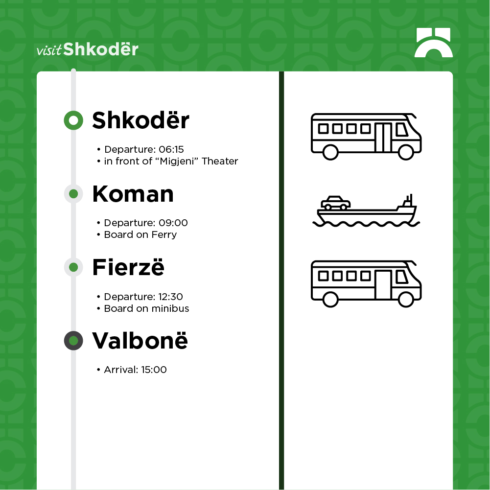To secure your seat in the van traveling to Koman, the boat ticket from Koman to Fierzë and from Fierzë to Valbone van, please follow these simple steps: